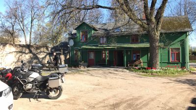 Dann sollte es noch nach Cinevilla gehen, ein Ort mit filmischen Kulissen und Fahrzeugen. Durch die direkte Sonne auf den Tankrucksack von Marko, wo sein Handy das GPS-Tracking durchführte, die Navigation zum nächsten Ziel suchen sollte und gleichzeitig geladen wurde, stieg genau dieses wegen Überhitzung aus, was uns zu einer kleinen Kaffeepause verhalf, um das Handy abzukühlen. Wir fanden gleich ein kleines Restaurant Engure, wo es Kaffe in alten Schmetterlingstassen und einem kleinen Schinken-Käse-Gebäck gab. Nun konnten wir uns Cinevilla mit seinen künstlichen Häusern, Forts oder Bahnhöfen inkl. alter Fahrzeug-, Schifffahrts- und Eisenahntechnick ansehen.