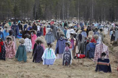 Dann ging es weiter nach Osten. Die nächsten Seen, den wir so sahen, waren noch zu Hälfte zugefroren. Wir haben heute den 31. Mai! Dieser Schwenk nach Osten, den wir ja führen, hatte ja seinen Grund, denn hier gab es aus unserer Sicht tatsächlich mal etwas besonderes in Finnland zu sehen, nämlich das “Stille Volk”. Das sind wohl so an die 1.000 Kreuze die jedes Jahr wieder mit einem Spatenstich aus Gras und ein wenig Wurzelwerk einen Kopf bekommen und dann eingekleidet werden, sodass man, wenn man am Straßenrand steht, von einer Armada von schweigenden Vogelscheuchen angestarrt wird. Das ist schon ganz schön skurril. Manche tragen neben Jacken, Mänteln oder Hemden mit Krawatte sogar Taschen oder Hüte, manche ein Kopftuch. Wir haben doch tatsächlich einen Helmträger entdeckt. Das Wiesencafé bereitete sich gerade mit ein paar Handwerkern auf die Eröffnung der Saison vor, die Anfang Juni sein wird, daher haben wir diesmal keinen Kaffee bekommen. Es sah jetzt aus, als ob sich der Himmel lichten wollte, aber dort, wo wir hin wollten war er tiefgrau. Die Temperaturen erreichten hier sogar 10 Grad. Das war heute mal warm für uns.