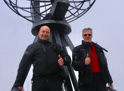 Also dann mal los. Der Weg hoch zum Nordkap war freier Sicht gut zu befahren und wir hatten einen schönen Blick in die Täler und auch auf der Hochebene. Doch dann, die letzten Meter vor dem Nordkap: Dichte Waschküche. Marko verschwand bei der Parkplatzsuche im Nebel. Die Sicht war einfach katastrophal. Nadel wir unsre Maschinen im Schnee abgestellt haben und durch den Schlamm zum BEsucherzentrum vorgingen es, kamen uns andere Biker entgegen und meinten, dass wir vor 30 Minuten was gesehen hätten. Schönen Dank auch. Aber wir hofften auf ein neues Zeitfenster mit Ausblick. Ich bestellte erst einmal 2 Kaffee und Marko ist erst einmal dem Royal Northcape Club beigetreten und hat nun lebenslang freien Eintritt und hat mit seinem Beitrag etwas für den Erhalt des Norkaps getan. Auch nach dem Kaffe und etwas Süßem wurde das Wetter nicht besser. Als es ein wenig Lichter wurde, ließen wir uns von einer Touristin mit unserer Kamera vor der Weltkugel ablichten.