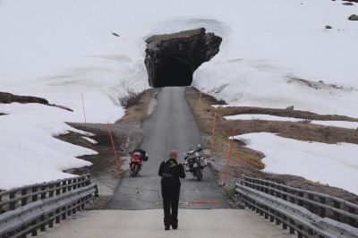 Jetzt ging es ab zum Storglomvatnet, einem Stausee. Auf dem Weg dorthin suchten wir eigentlich einen Aufstieg über eine Felsentreppe, über die man zu einer Hütte aufsteigen kann und wohl den schönsten Blick über Norwegen hat. Also ging es immer weiter nach oben durch einen Tunnel ohne Beleuchtung und gelangen zu einer Kreuzung, an der sich die Straße jeweils in eine andere Richtung zum selben Stausee. Der Weg nach rechts war allerdings zugeschneit, der andere war auch nicht so richtig offen. An dieser Stelle stand tatsächlich ein Camper mit einem norwegischen Pärchen, die wir zum Zustand der Straßen befragten. Die Straßen sind wohl bis kurz vor dem Stausee frei und dann müsse man noch ca. 400 Meter laufen. Also los. Es ging durch eine schneebedeckte Welt mit hohen Felswänden auf beiden Seiten wieder auf einen Tunnel zu. Dieser fuhr sich mit einem mal sehr seltsam und unsere Maschinen kamen ins schlingern. Alles klar, hier war aufgewühlter Schotterboden. Wenn man sich an den dunklen Tunnel gewöhnt hat, ging es so einiger Maßen. Dann kam allerdings auch noch Eis dazu, was vermutlich aus der Schneeschmelze entstanden ist. Als wir aus dem Tunnel kamen war dann auch Schluss. Die Straße warst Ketten gesichert. Also absteigen und wandern. Wir hatten jetzt Blick auf die Rückwand der Staumauer, die nur aus gestapelten Felssteinen zu bestehen schien. An einem Bach entlang sahen wir schon die Brücke, die zu Staudamm hinüberging, doch als wir ankamen, war die Enttäuschung groß.alles war noch zugeschneit. Kein rüberkommen. Na dann wieder zurück zu den Maschinen. Nun mussten wir wieder durch den vereisten Tunnel, diesmal abwärts. Es war sehr anstrengend aber als wir wieder herrauskamen war es einfach nur toll. Dann noch durch den zweiten Tunnel, der zwar genauso dunkel und die Fahrbahn auch mit Schlaglöchern übersäht war, und siehe da, fanden wir am Parkplatz nach dem Tunnel auch die Felsentreppe. Um diese zu erreichen musste man aber noch über eine Hängebrücke, die so an die 10 Meter über einem reißenden Strom hing. Die Treppe, die sehr steil nach oben ging, wollten wir dann aber ich mehr nutzen.